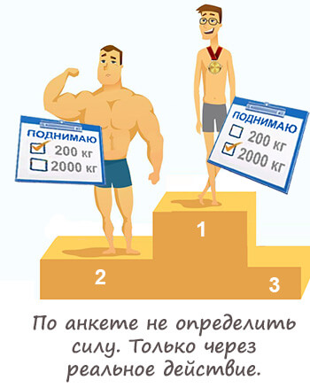 По одному лишь ответу на вопрос нельзя оценить ни физическую силу, ни уровень психической энергии. Представьте, что спортсменам раздают анкеты и просят отметить галочкой вес, который они могут поднять, или выбрать картинки с гирями, которые им нравятся. Вы будете всерьез воспринимать результаты такого теста на физическую силу?
