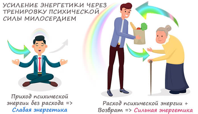 Как влиять на энергетику человека? Важное свойство психической энергии состоит в том, что её накопление происходит, когда мы творим добро, а отказ от доброго поступка ведет к ее расточению. То есть излучение позитивной психической энергии ведет в общем балансе не к ее растрате, а к ее накоплению. Именно поэтому добрые поступки укрепляют организм человека и люди с сильной энергетикой своего биополя получают здоровье, радость и душевное равновесие.